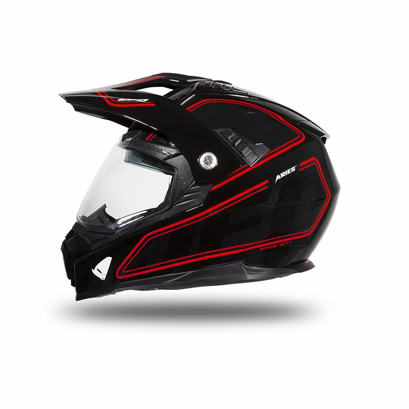 ARIES is the new Ufo Plast enduro helmet with a good value for money, a product designed to move comfortably and safely without sacrificing style that will appeal especially to younger people, ideal from grand touring to off-road routes. The high resistance thermoplastic shell, the compact dimensions, the extremely refined finishings and the design that recalls the cross lines make ARIES an extremely safe and attractive product.